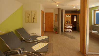 Nach einem langen Bergtag, oder wenn die Sonne mal nicht scheinen mag, können Sie unsere kleine Wellness- Oase nutzen. Im Ruheraum ist der Blick auf die Berggipfel gerichtet.